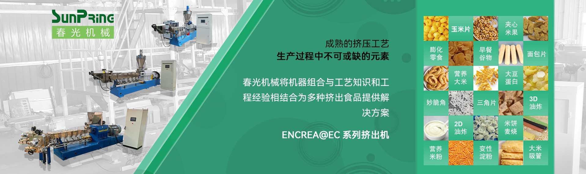 春光机械在挤压膨化技术方面的探索和研究,使螺杆挤压膨化技术应用领域更为广泛。我们的产品包括:膨化机、膨化机械、双螺杆膨化休闲食品生产线、夹心米果生产线、宠物食品生产线、狗粮机、狗粮设备、狗粮膨化机、漂浮鱼饲料膨化机、观赏鱼饲料设备、鱼虾水产饲料生产线、宠物饲料设备、早餐谷物玉米片生产线、预糊化变性淀粉设备、双螺杆膨化机、单螺杆挤压机、营养强化大米生产线、...